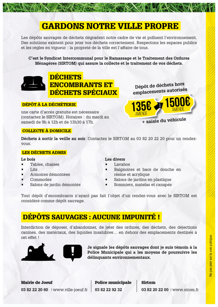 La propreté de notre ville est l’affaire de tous. Les dépôts sauvages de déchets nuisent à notre cadre de vie, dégradent l’environnement et portent atteinte à l’image de notre commune. Pourtant, des solutions simples existent pour se débarrasser de ses déchets dans le respect des règles.